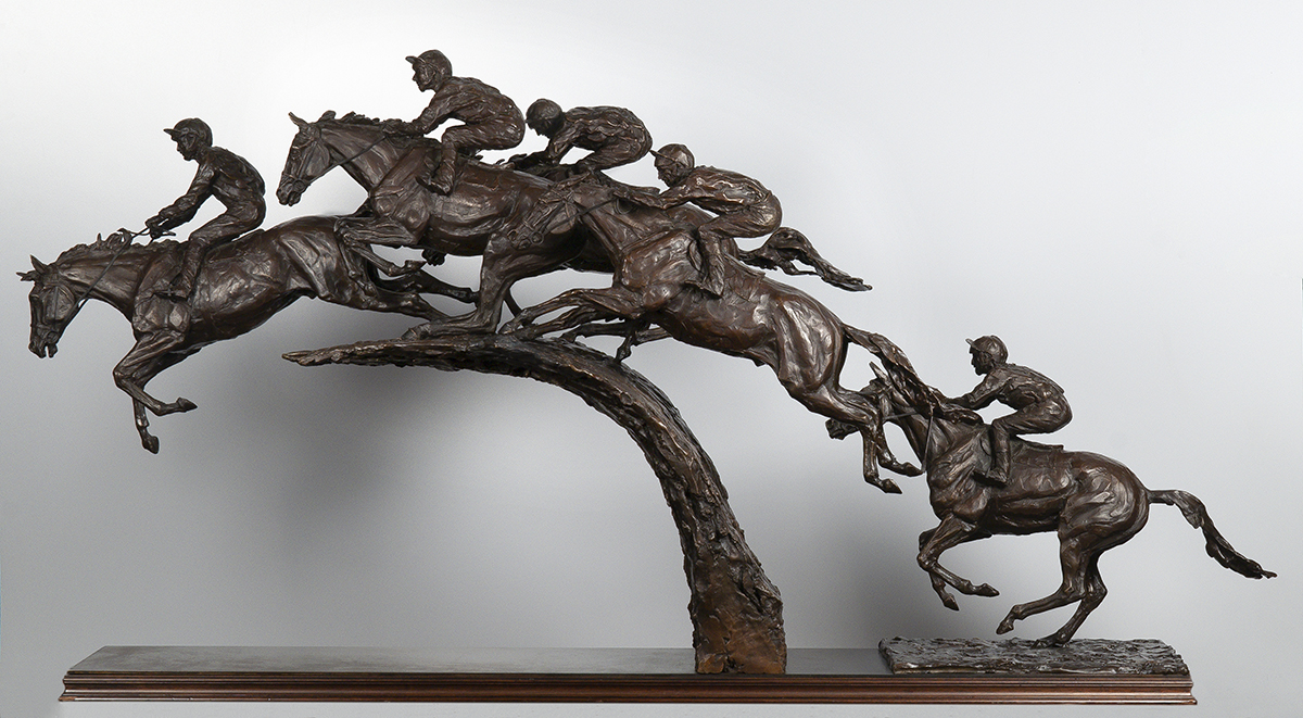 bronze sculpture of five jockeys on horseback as they leap over the hedge, it looks like they are cresting a wave.