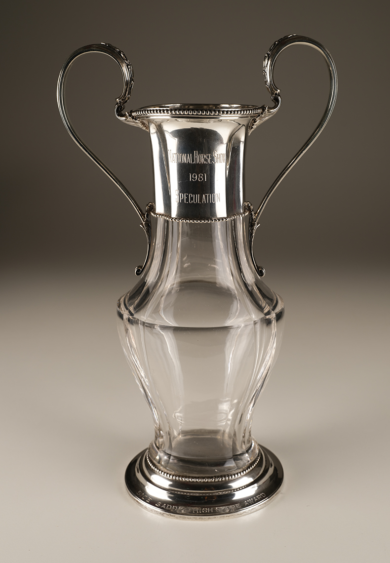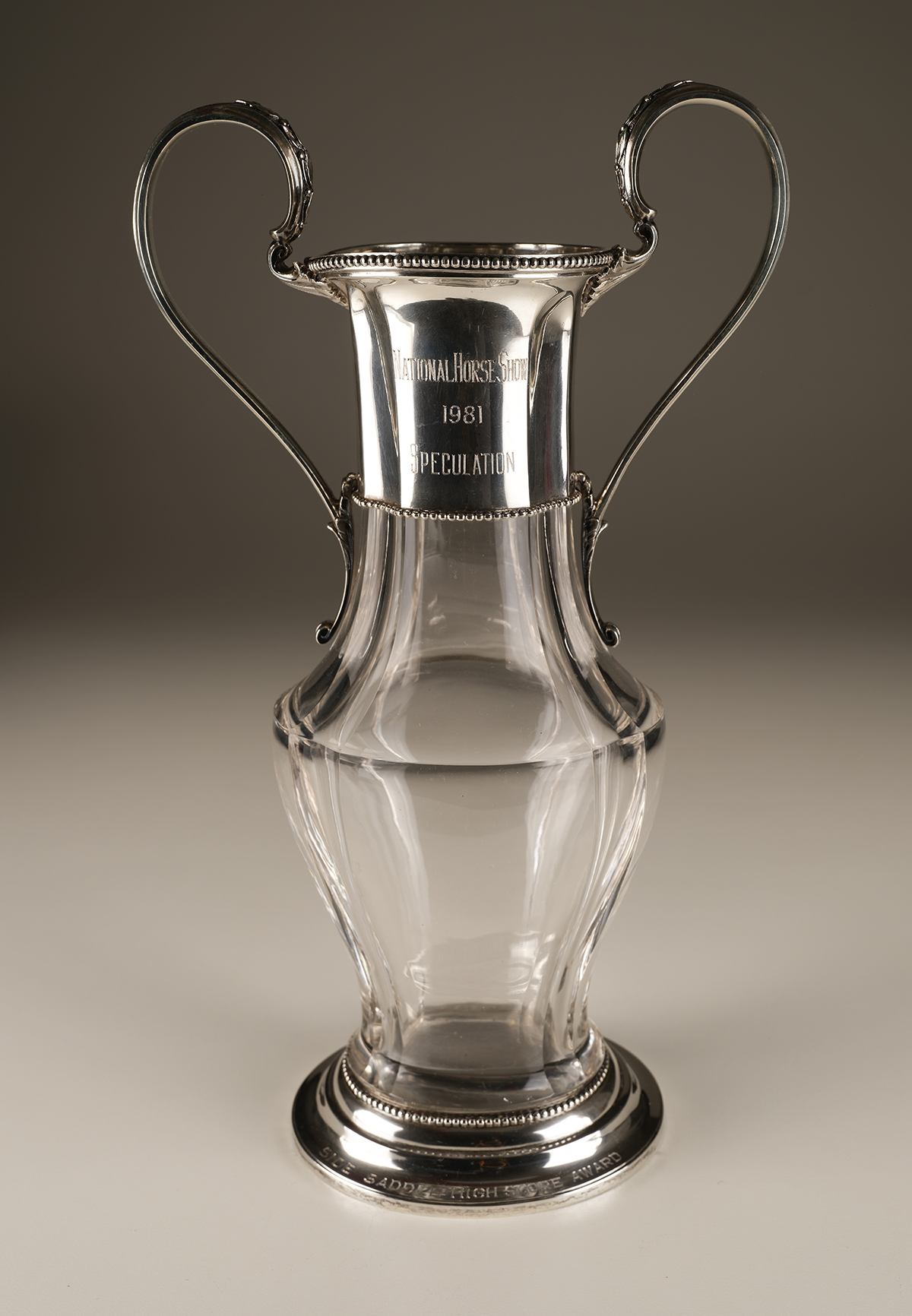 Two-armed trophy with silver neck and base; glass body. Engraved inscription on neck, "National Horse Show / 1981 / Speculation"
