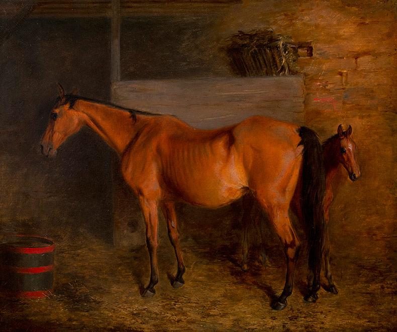 Swiss-born artist Edward Troye painted portraits of race horses in America throughout the middle of the 19th century. This painting of a bay colored mare ("bay" means brown coat with black mane and tail) and her foal was commissioned by William Ransom Johnson (1782-1849). Johnson was a leading owner of Thoroughbreds and earned the nick-name of “Napoleon of the Turf,” due to his many champion horses. Troye traveled to his farm, called “Oaklands,” in Chesterfield County, Virginia, to paint this and several other paintings in 1833.