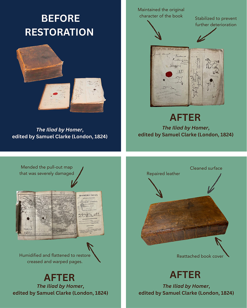Each book has unique restoration needs. We recently restored The Iliad by Homer, edited by Samuel Clarke (London, 1824) from our collection…